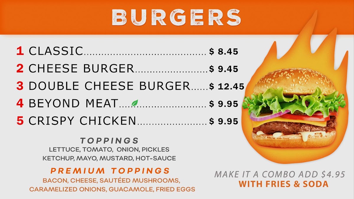 - Burgers: A selection of traditional and specialty burgers available all day. Options include the Classic Burger, Cheese Burger, Double Burger, Beyond Meat burger as a plant-based alternative, Crispy Chicken burger, and a Double Cheese Burger. These items provide a range of choices from single to double patty servings.