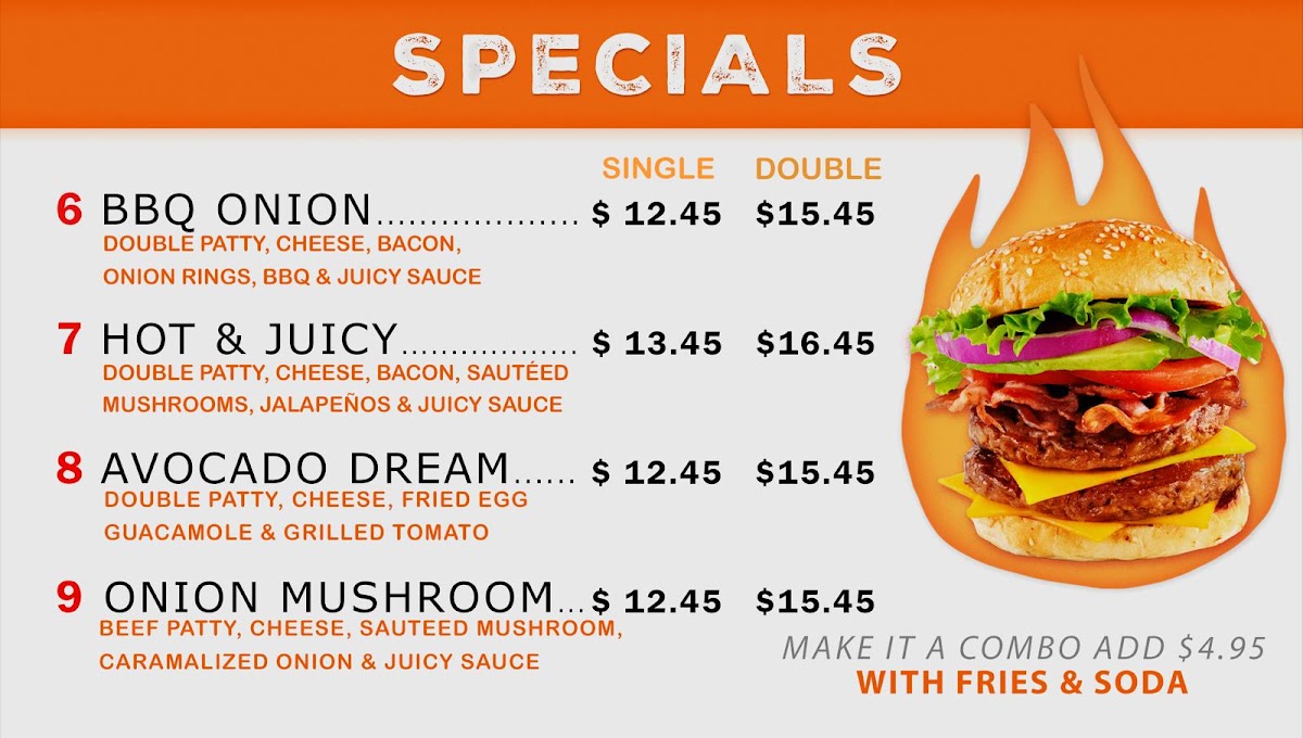 The menu at Hot and Juicy features a variety of items centered around classic hamburger offerings. The menu is structured into distinct groups including burgers, salads, and wraps, suitable for quick meals or casual dining throughout the day.